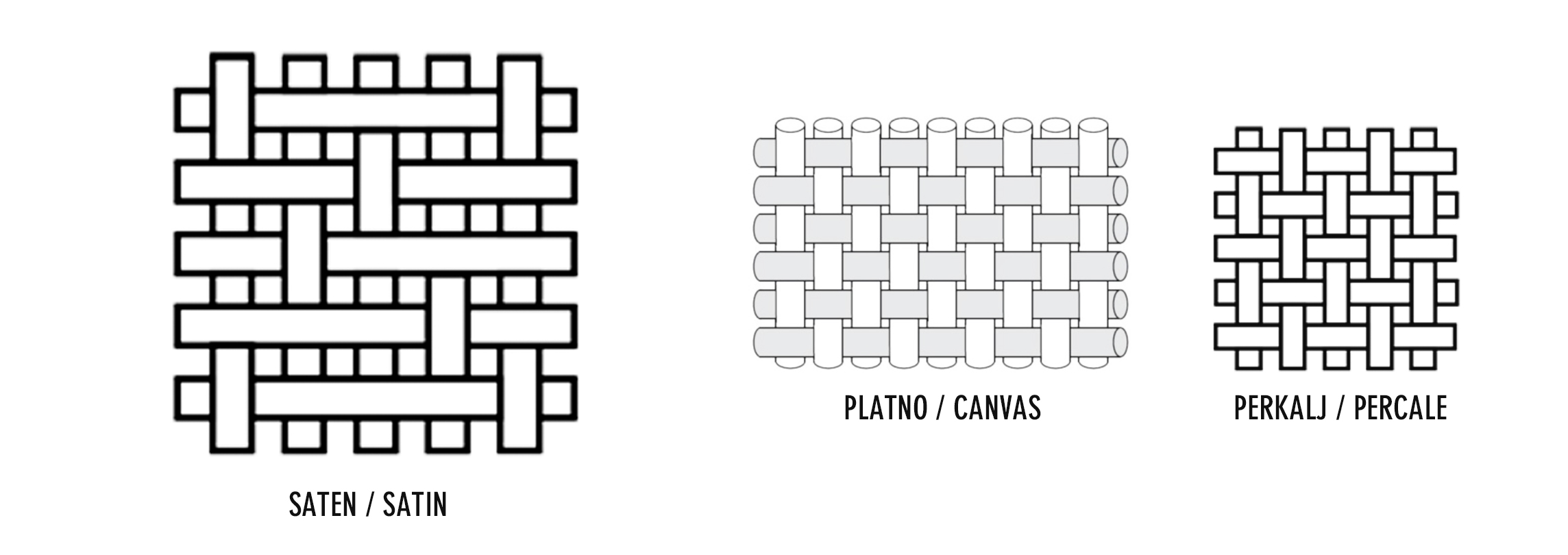Saten se dobiva atlasnim vezom kod kojeg osnovna nit povezuje svaku petu potku. Manje dodirnih točaka u tkanju znači više niti na površini što satenu daje glatkoću i sjaj. Saten je prvi odabir luksuznih hotela zbog mekoće, izraženog sjaja i ugodnog osjećaja na dodir. Naravno, da bi satenska posteljina bila izdržljiva, mora biti izrađena od kvalitetnog pamuka s visokim brojem niti.